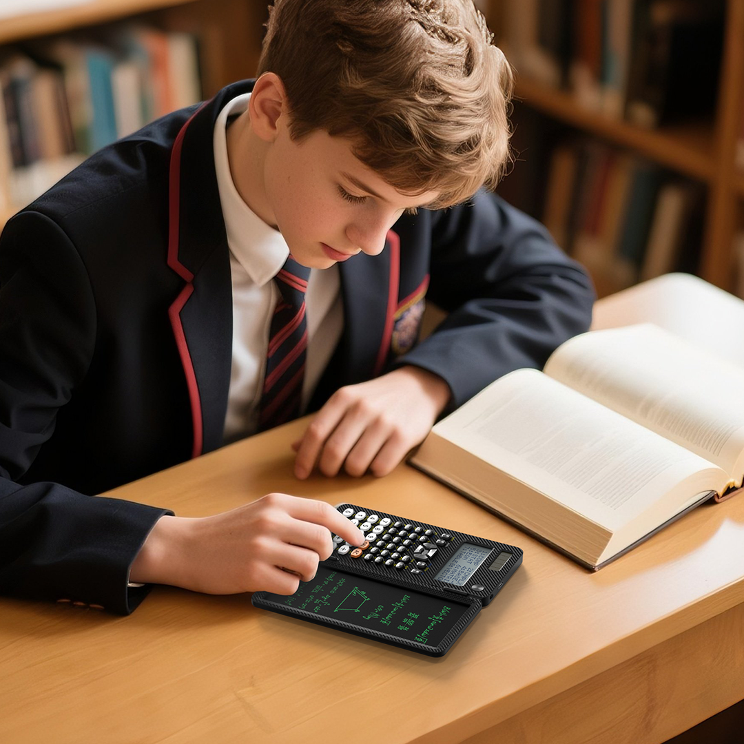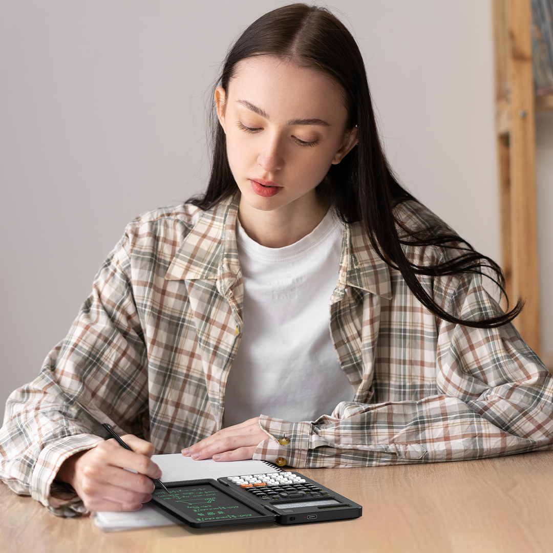 "I just got this calculator with a writing pad, and honestly it’s super practical. I can do quick calculations and jot down notes in one place. It makes studying a lot more efficient😺"