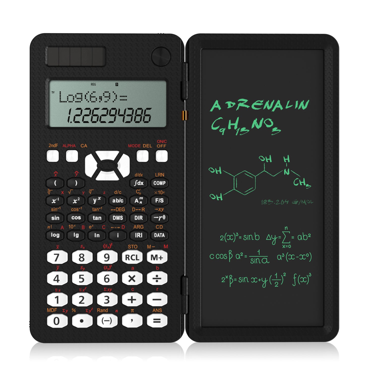Rechargeable & Solar power scientific calculator, multi-view 6-line display with erasable LCD writing tablet for high school college graduate students and researchers.