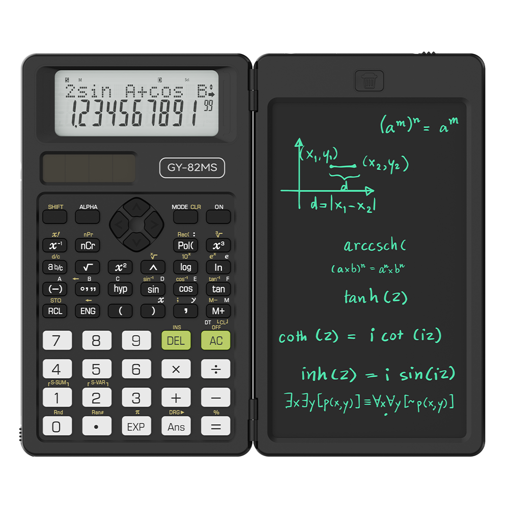 Scientific calculator for school with notepad, middle and high school supplies for students, 82 MS foldable 2-line display science calculator with writing tablet, solar and battery powered.